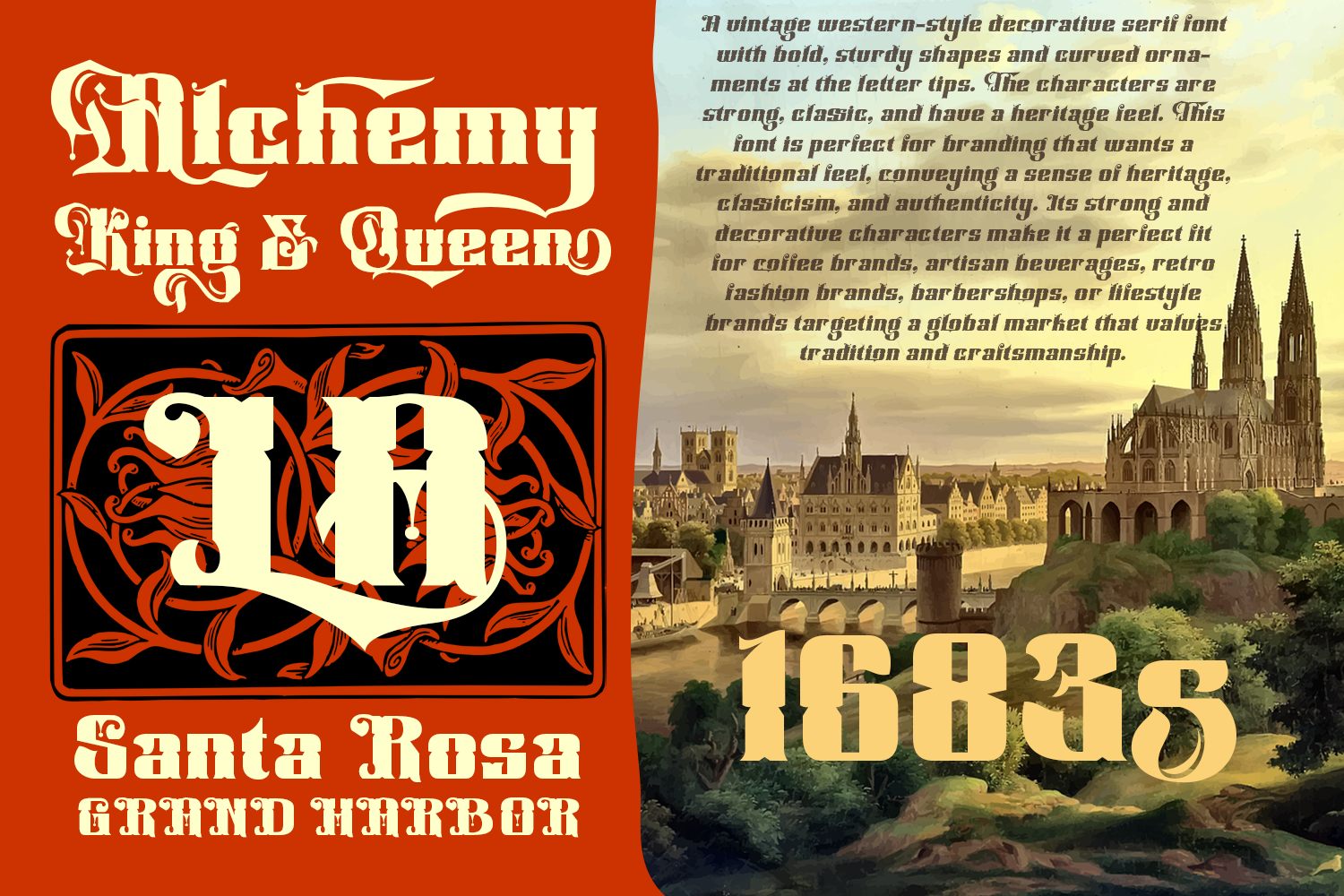 Introducing Cleffordy is a vintage western style traditional serif font with bold, sturdy shapes and curved ornaments at the letter tips. The characters are strong, classic, and have a heritage feel. This font is perfect for branding that wants a traditional feel, conveying a sense of heritage, classicism, and authenticity. It’s strong and decorative characters make it a perfect fit for coffee brands, artisan beverages, retro logo, barbershops, or lifestyle brands targeting a global market that values tradition and craftsmanship.