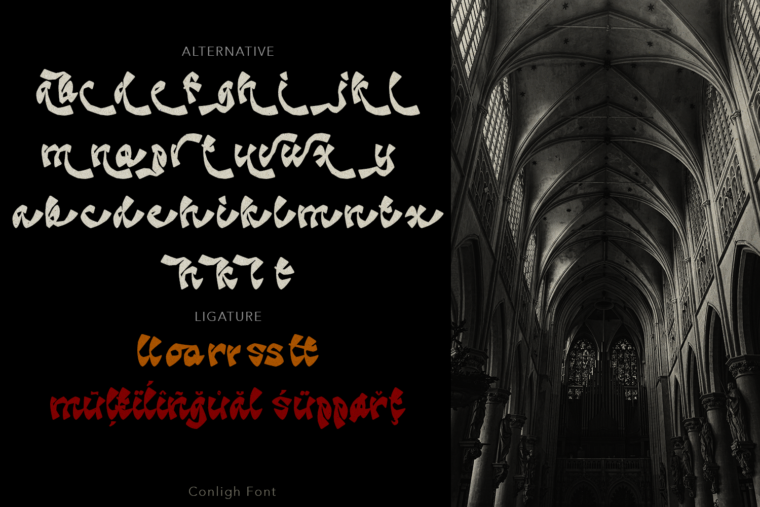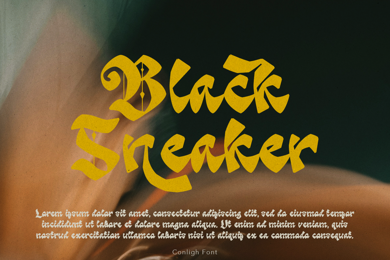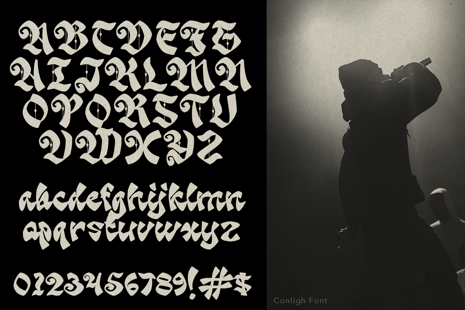 Conligh is a modern blackletter font, made with a stylish impression and supported by alternative with references to various letters that I combine. This font suitable to create any branding, product packaging, invitation, quotes, t-shirt, label, poster, logo etc.