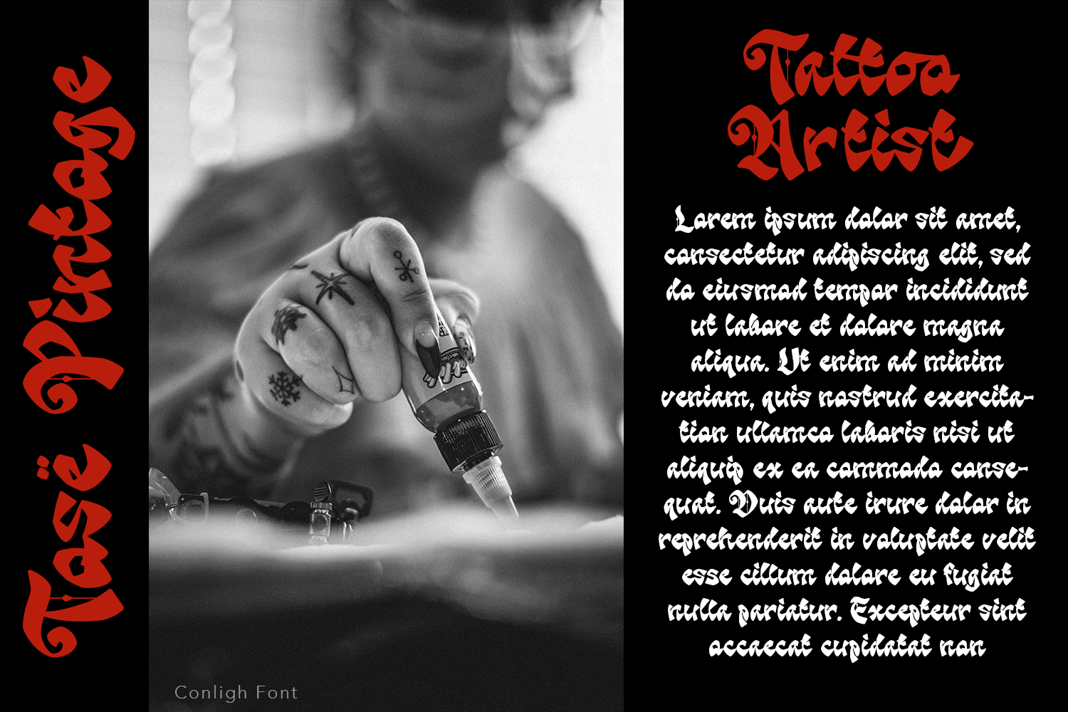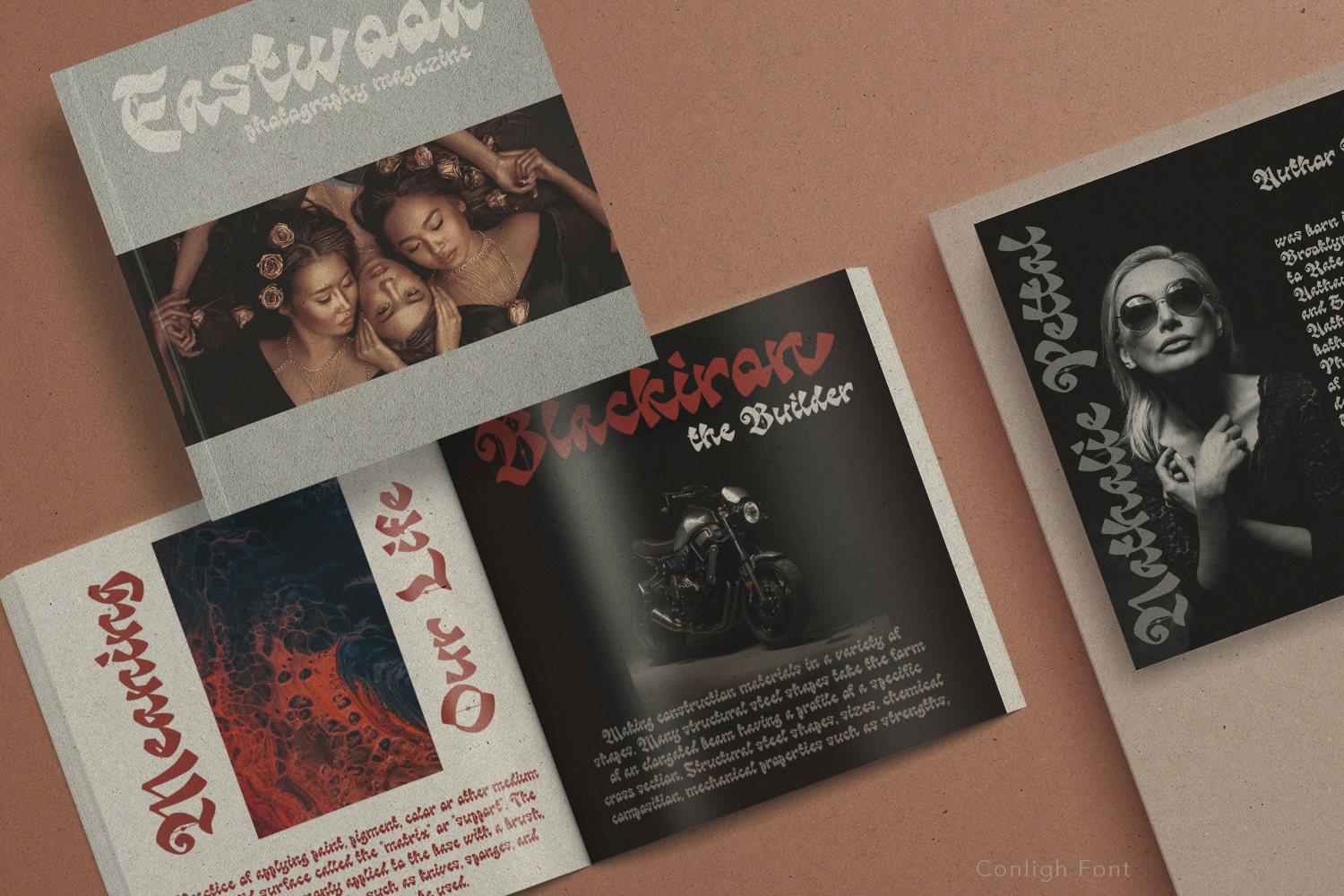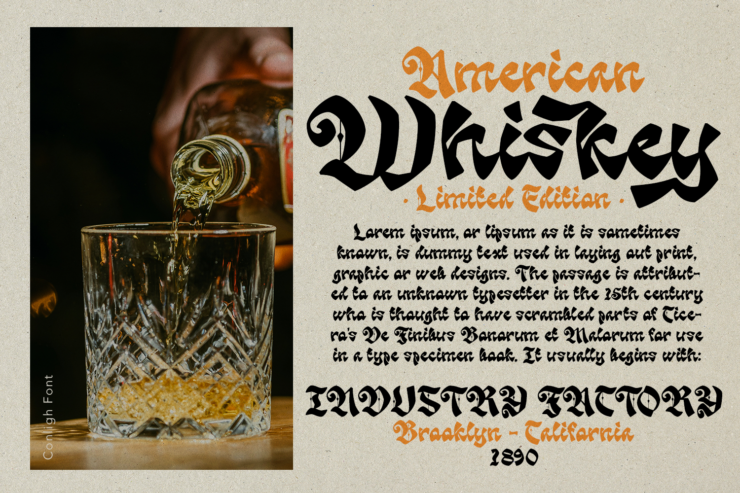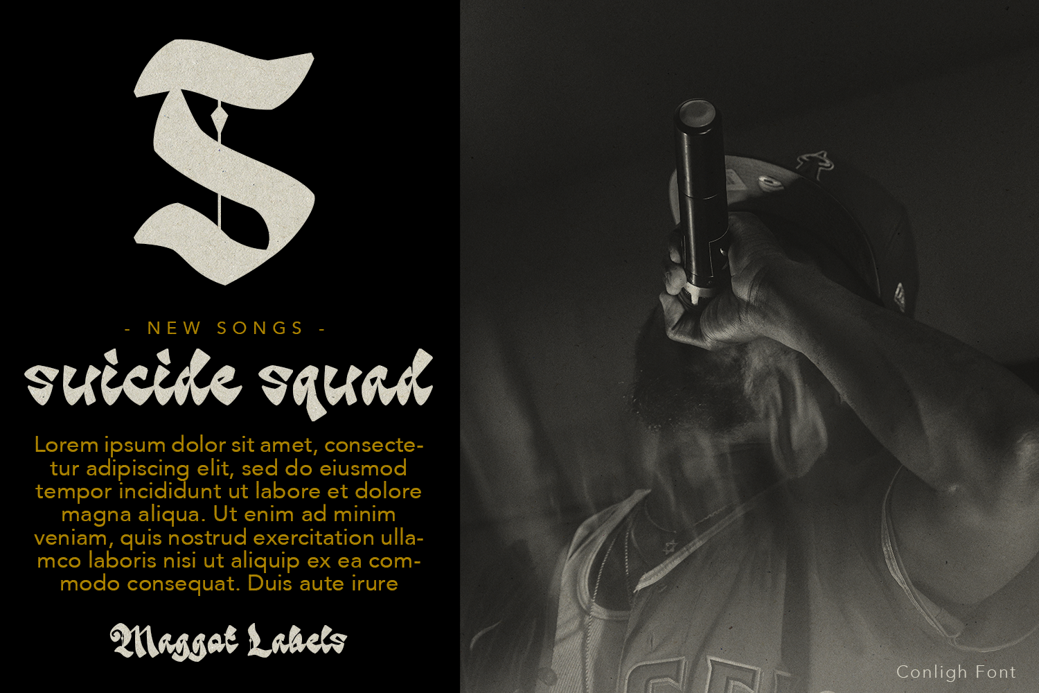 Conligh is a modern blackletter font, made with a stylish impression and supported by alternative with references to various letters that I combine. This font suitable to create any branding, product packaging, invitation, quotes, t-shirt, label, poster, logo etc.