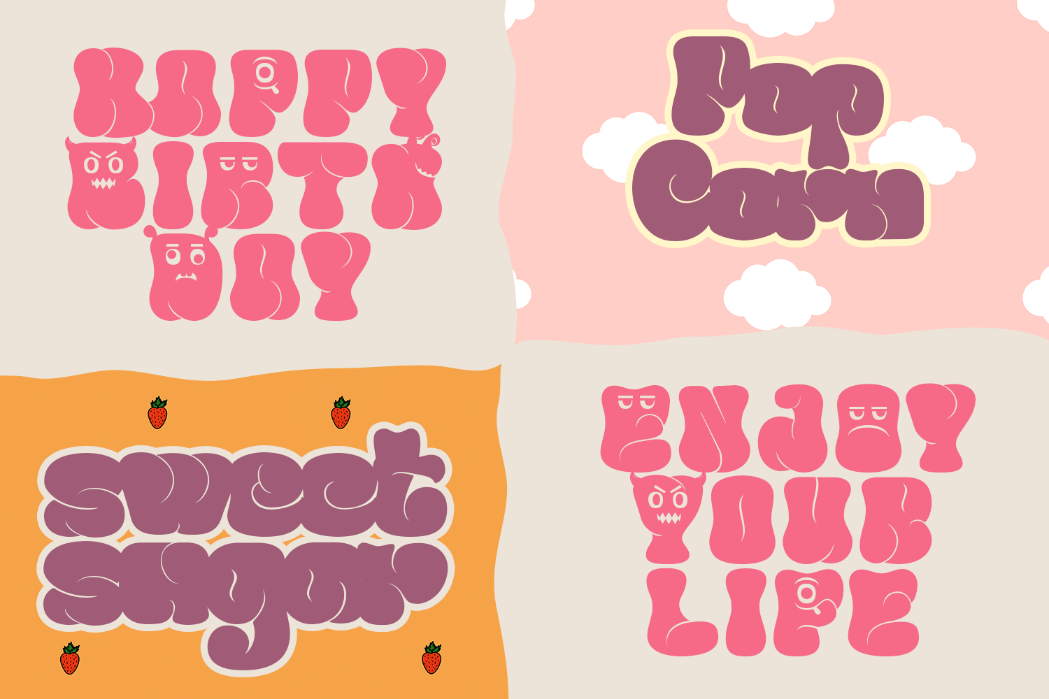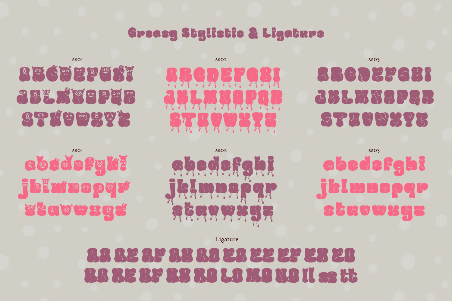 Introducing Greasy bubble font, a bold typeface that exudes confidence while maintaining a warm impression. This font enhances text visibility, making it striking and appealing. Ideal for designs aiming to convey a cheerful and welcoming atmosphere, it adds a fresh touch that enlivens every element. With its easy readability and meticulously crafted glyphs, this font transforms simple words into beautiful expressions, making it a versatile choice for various creative projects.