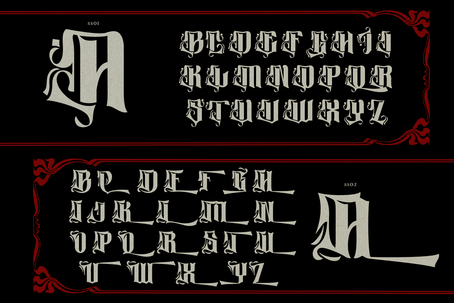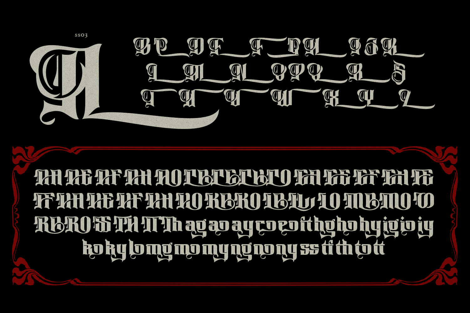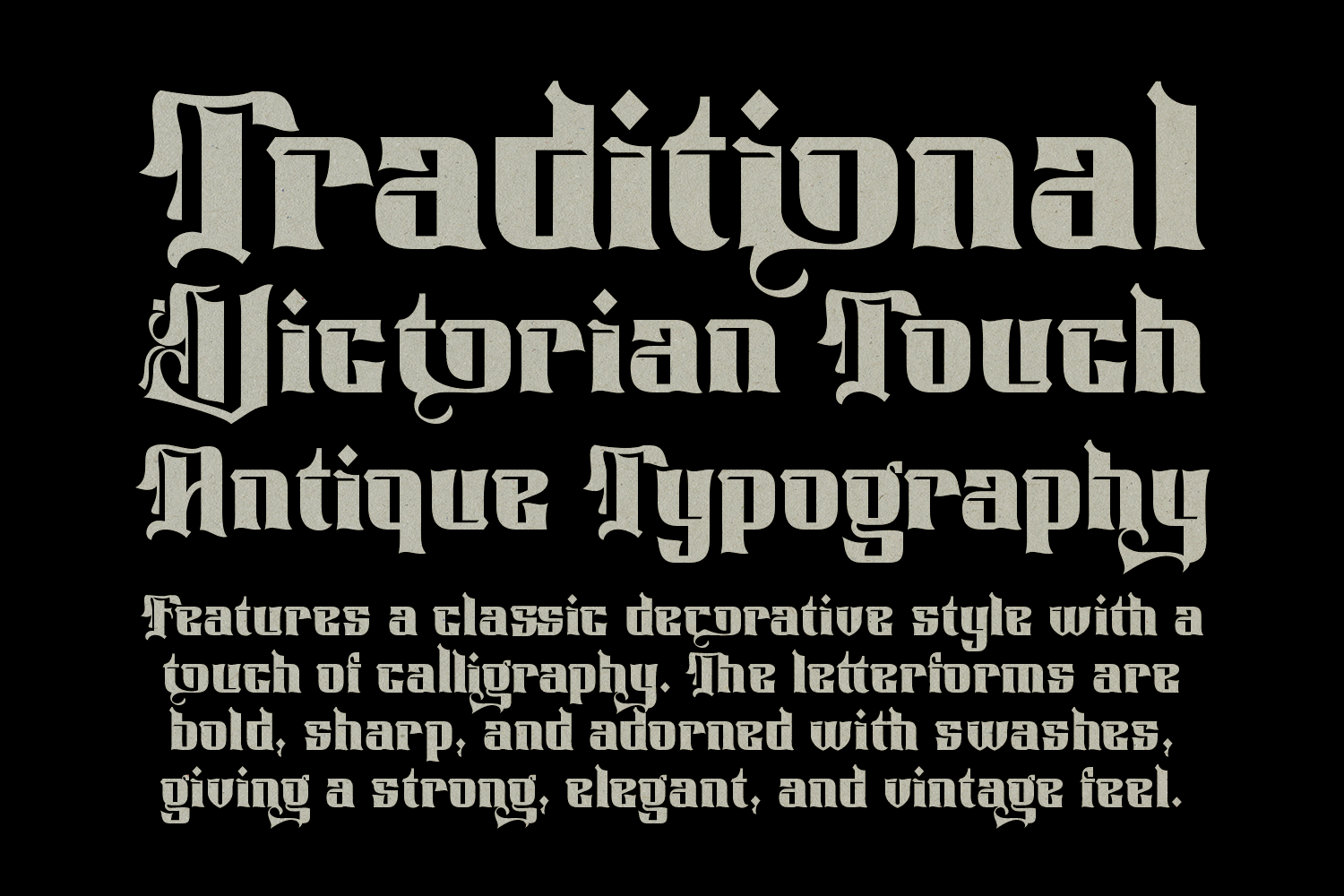 Introducing Helarctos, this font features a classic antique style with a touch of Victorian typography era. The letterforms are bold, sharp, and adorned with swashes, giving a strong, elegant, and vintage feel. The characters are artistic and bold, easily attracting attention, making this font ideal for titles, logos, branding, posters, merchandise, and tattoo designs.