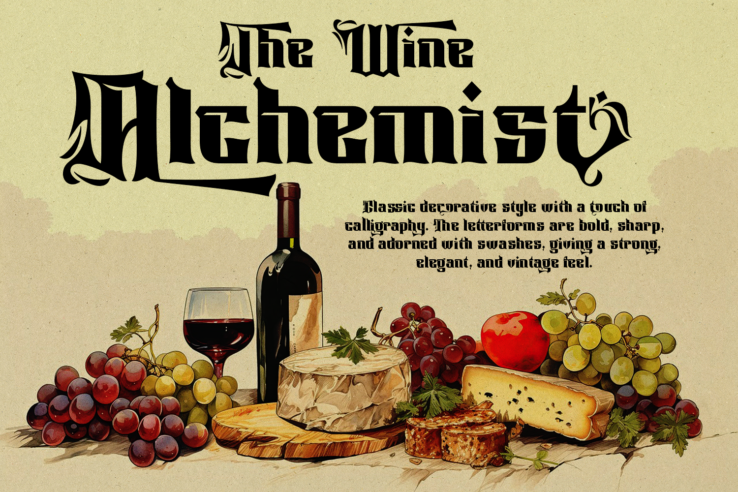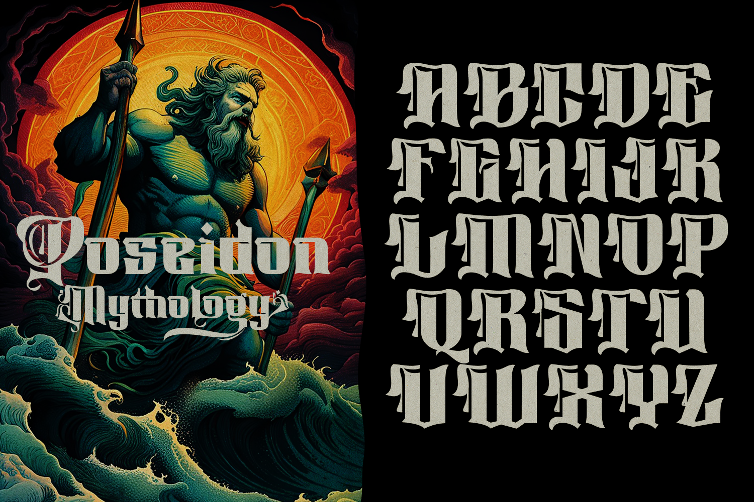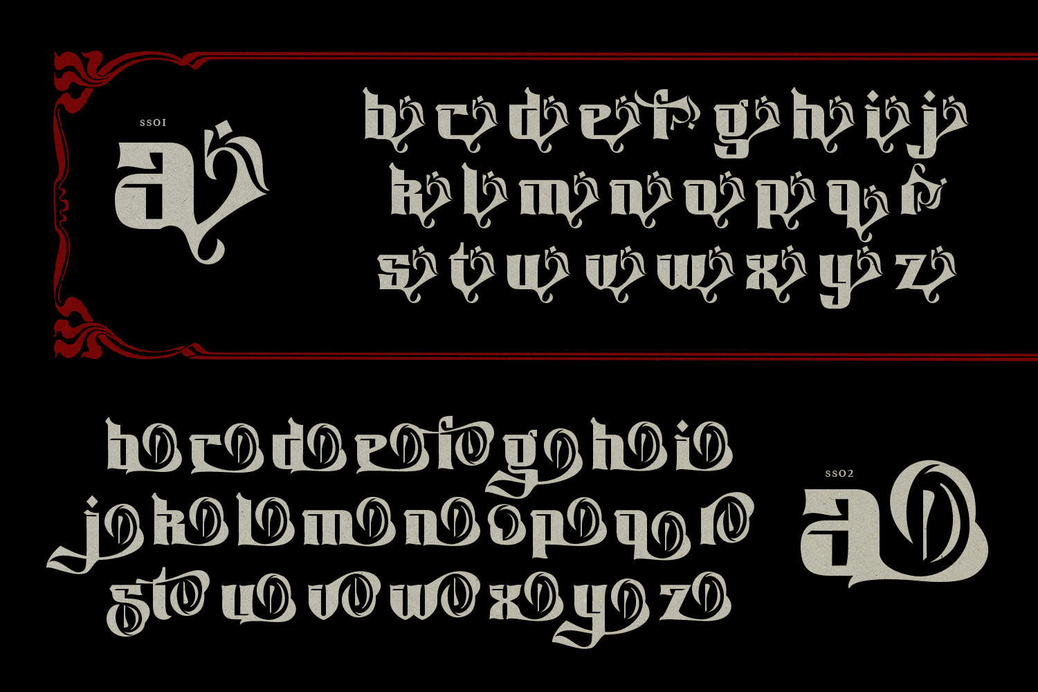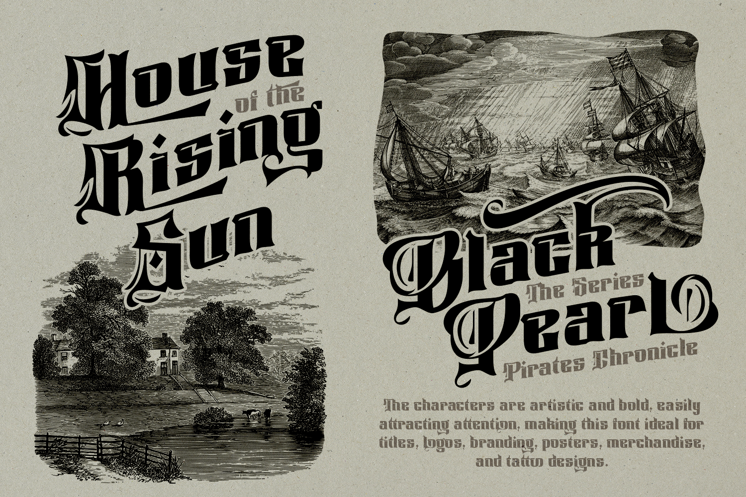 Introducing Helarctos, this font features a classic antique style with a touch of Victorian typography era. The letterforms are bold, sharp, and adorned with swashes, giving a strong, elegant, and vintage feel. The characters are artistic and bold, easily attracting attention, making this font ideal for titles, logos, branding, posters, merchandise, and tattoo designs.