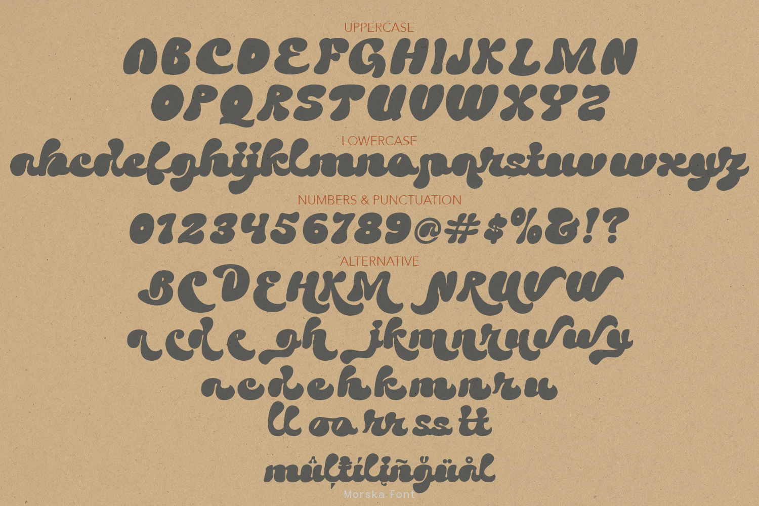 Morska is a heavy groovy font come with 80’s script style. Retro and refined you can explore and combine creating rhythm for comfortable reading. This font perfect for any projects, such logotype, stickers, greeting / wedding cards, packaging design, headlines, brand identity, t-shirt, posters, magazines, books, Instagram, websites, and many more.