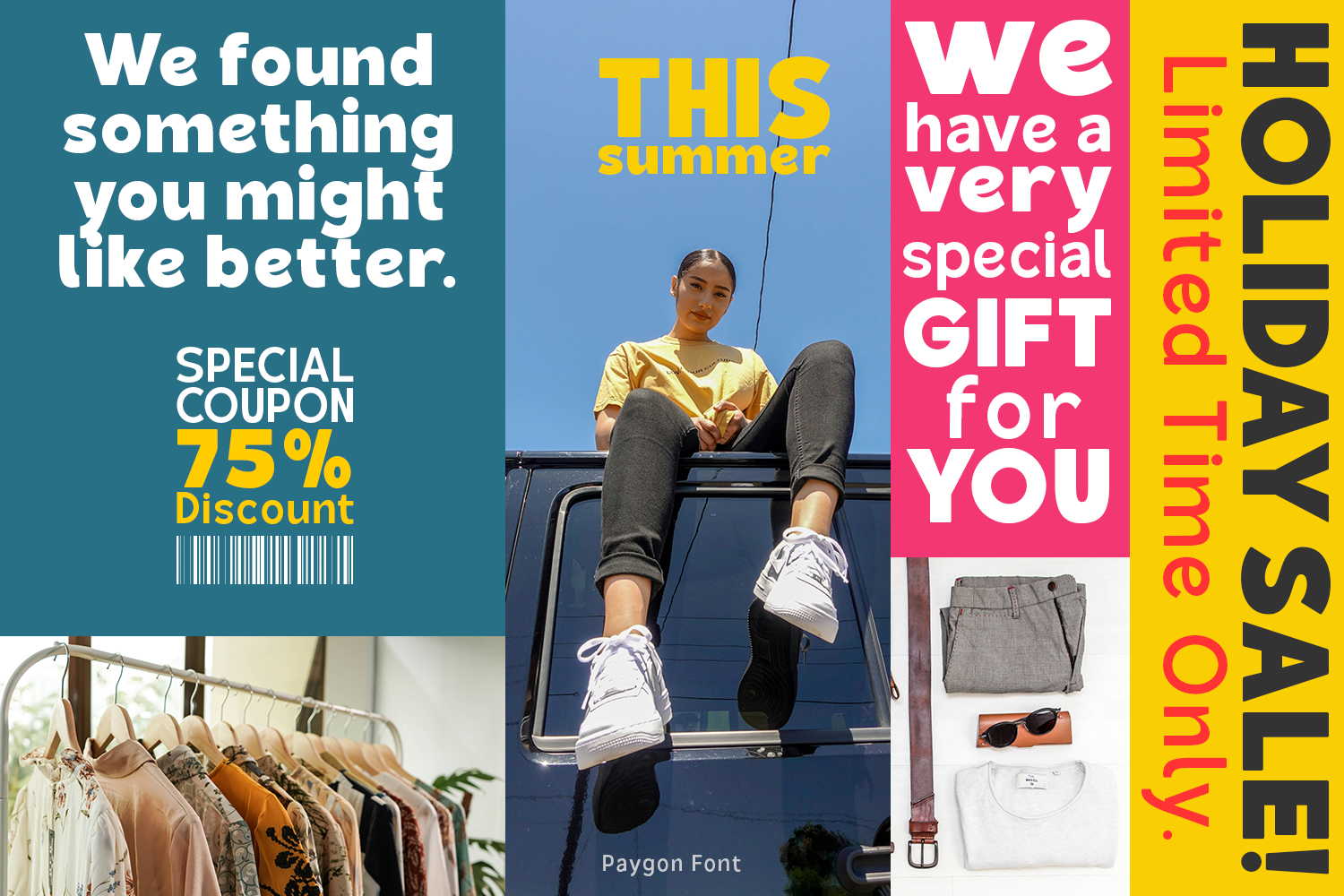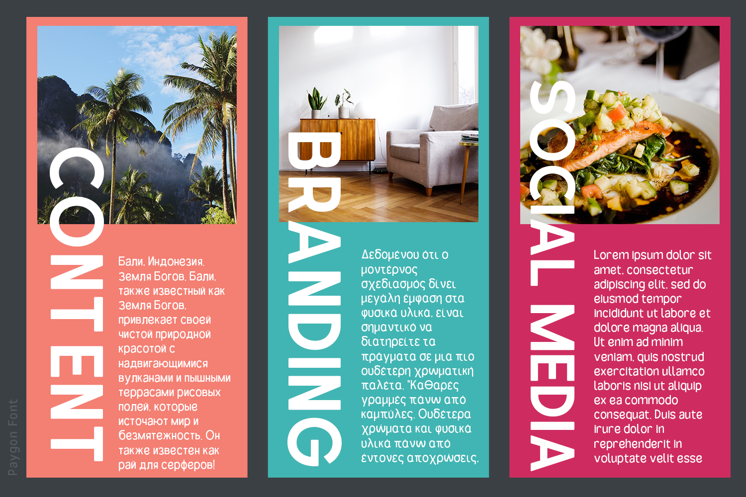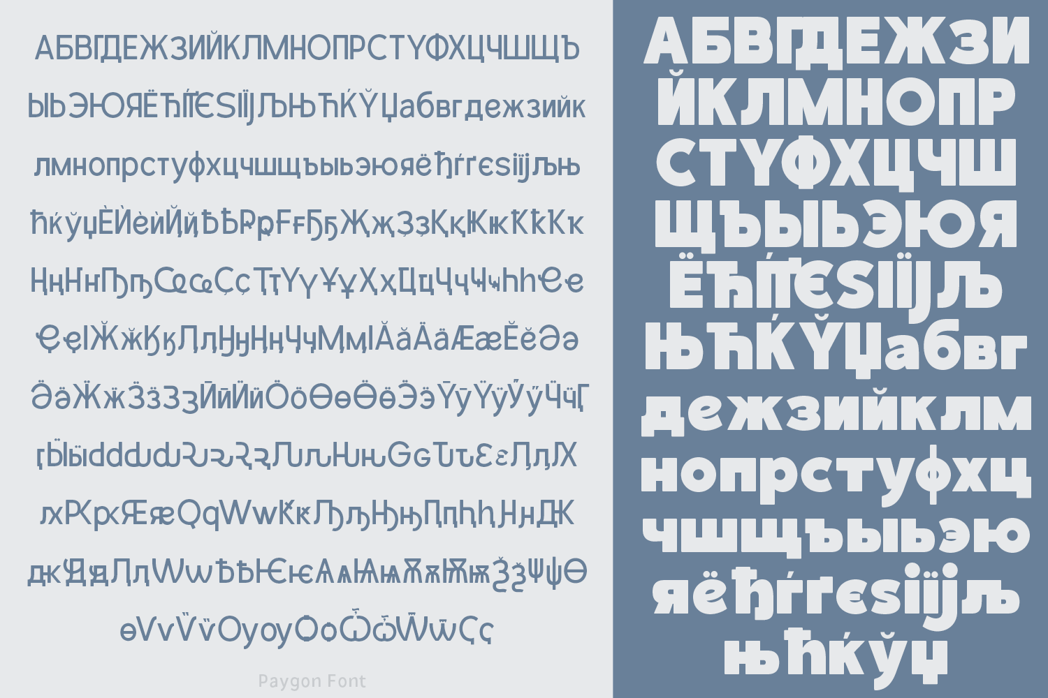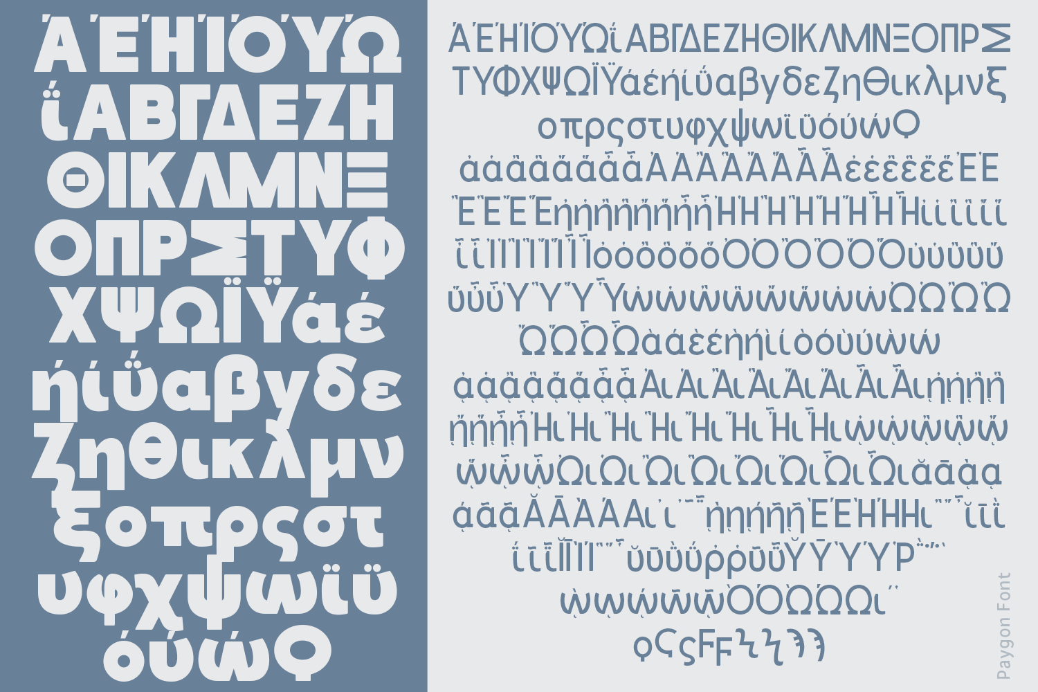 Paygon is a sans serif family. Design with various width and weight that you can explore and combine creating rhythm and texture for comfortable reading. This font supports more than 100 Latin-based languages and has extensive Cyrillic and Greek support for languages like Russian, Bulgarian, Ukrainian, and many more. In variable version, it allows multiple options when designing, adapting to different composition solutions.