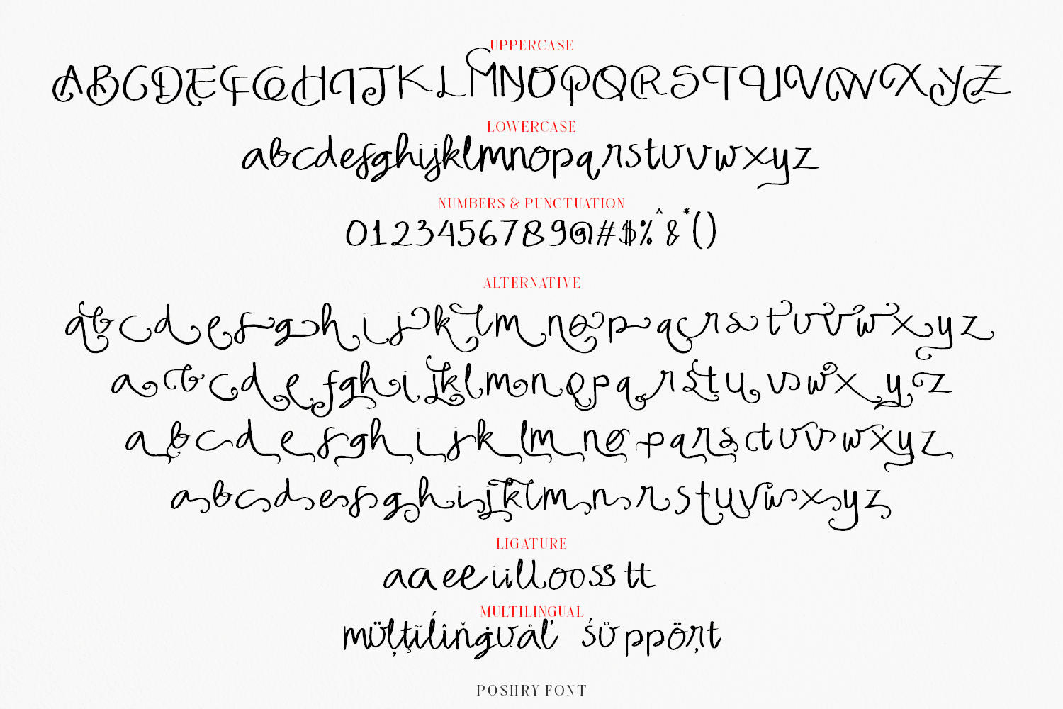 Poshry is a realistic handwritten font to give an incredible impression for all your project design come with ligatures and Alternative to make everything look realistic handmade handwritten. This font perfect for poster design, book covers, merchandise, fashion campaigns, newsletters, branding, advertising, magazines, greeting cards, album covers, and quote designs and more.