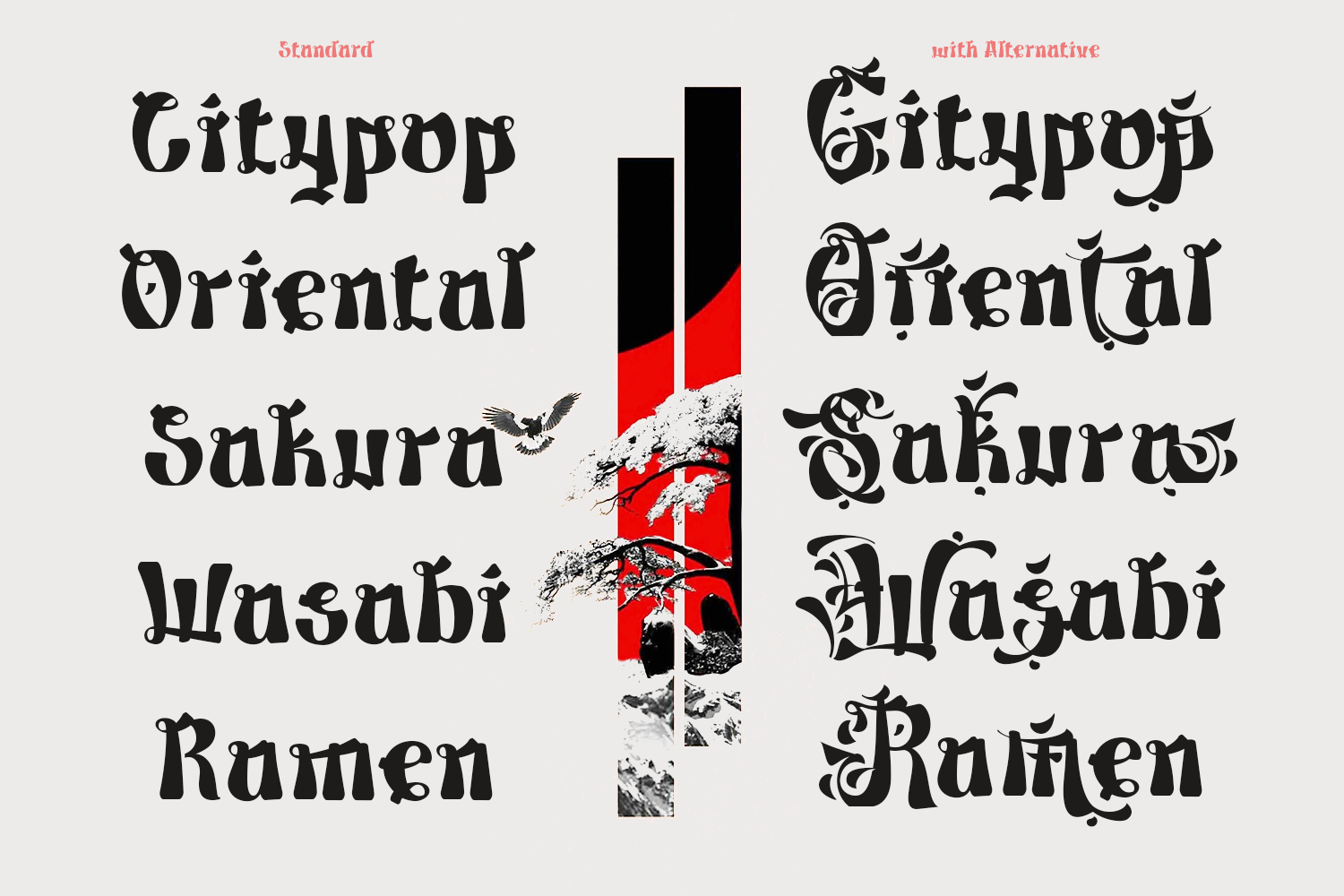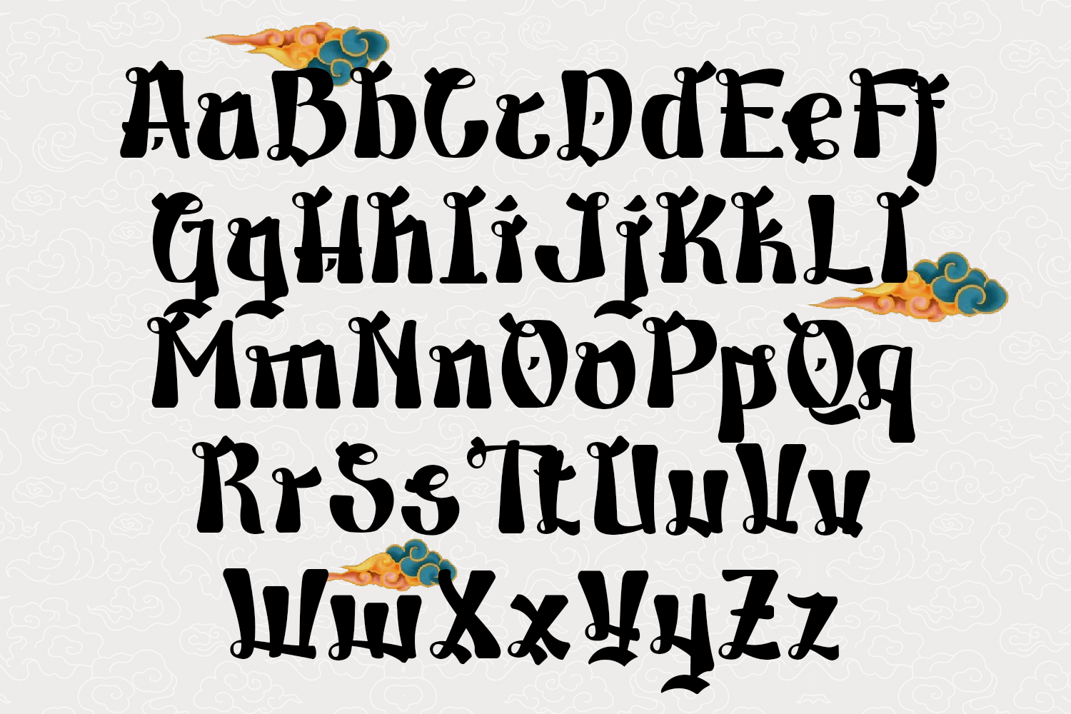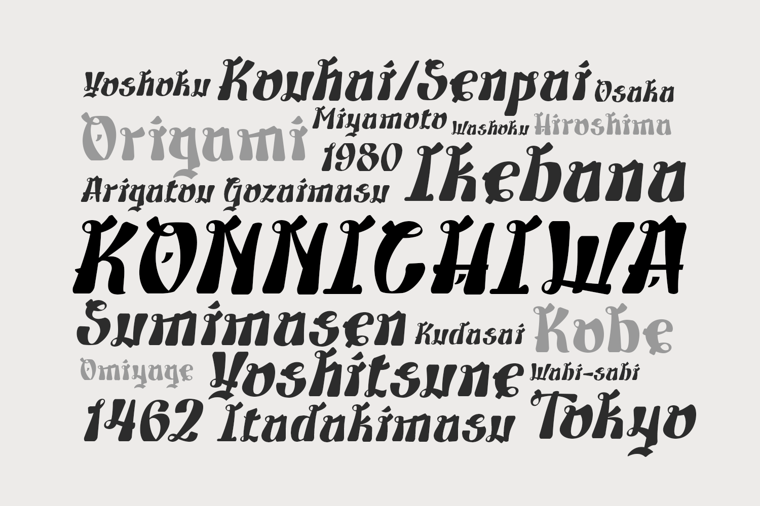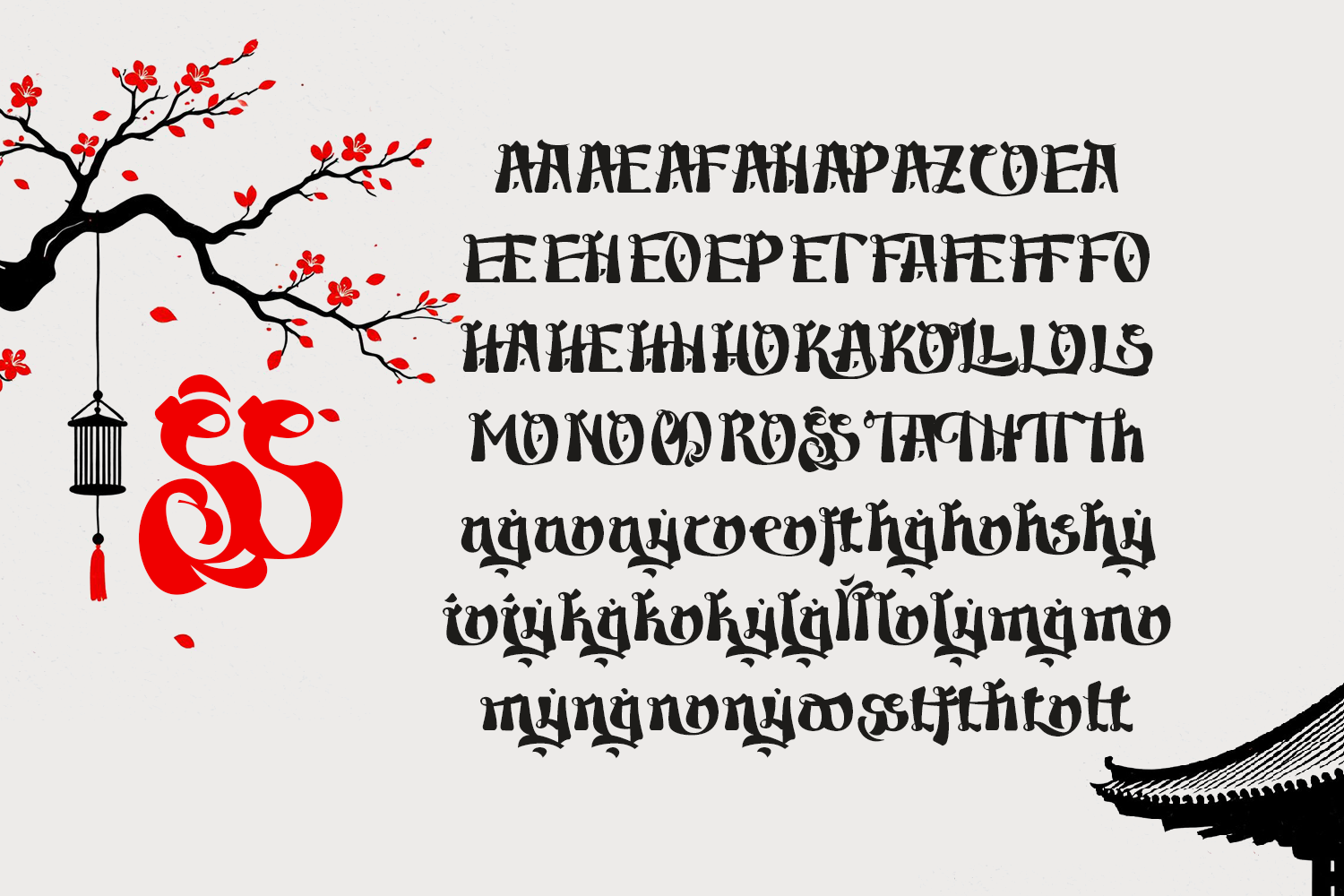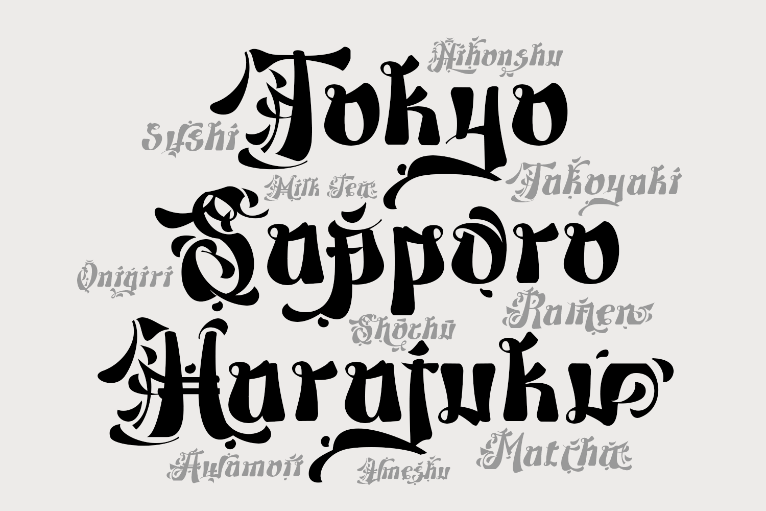 This decorative font is inspired by the structure of Japanese kanji characters, evident in the letterforms, which resemble traditional calligraphic brushstrokes. Each character features contrasting thick and thin lines, pointed tips, and bold, dynamic curves, creating a strong, artistic, and expressive impression, reminiscent of typical Japanese handwriting. Inspiration conveys the authentic and classic feel of Japanese culture, yet is presented in a modern form using the Latin alphabet. This gives the font a unique, exotic look and a strong visual identity. Ideal for branding that wants to emphasize Japanese or oriental characteristics, such as Japanese restaurants, streetwear brands, anime merchandise, games, Japanese beverages, and even Japanese cultural events. Furthermore, this font is also effective for poster designs, logos, and visual content that wants to appear bold, artistic, and memorable.