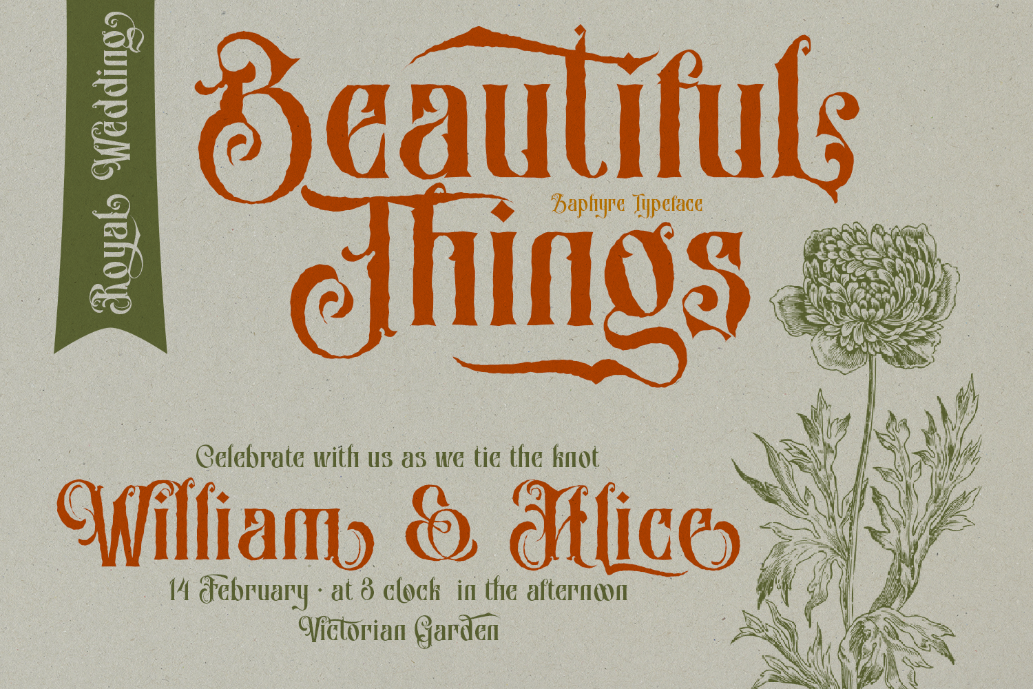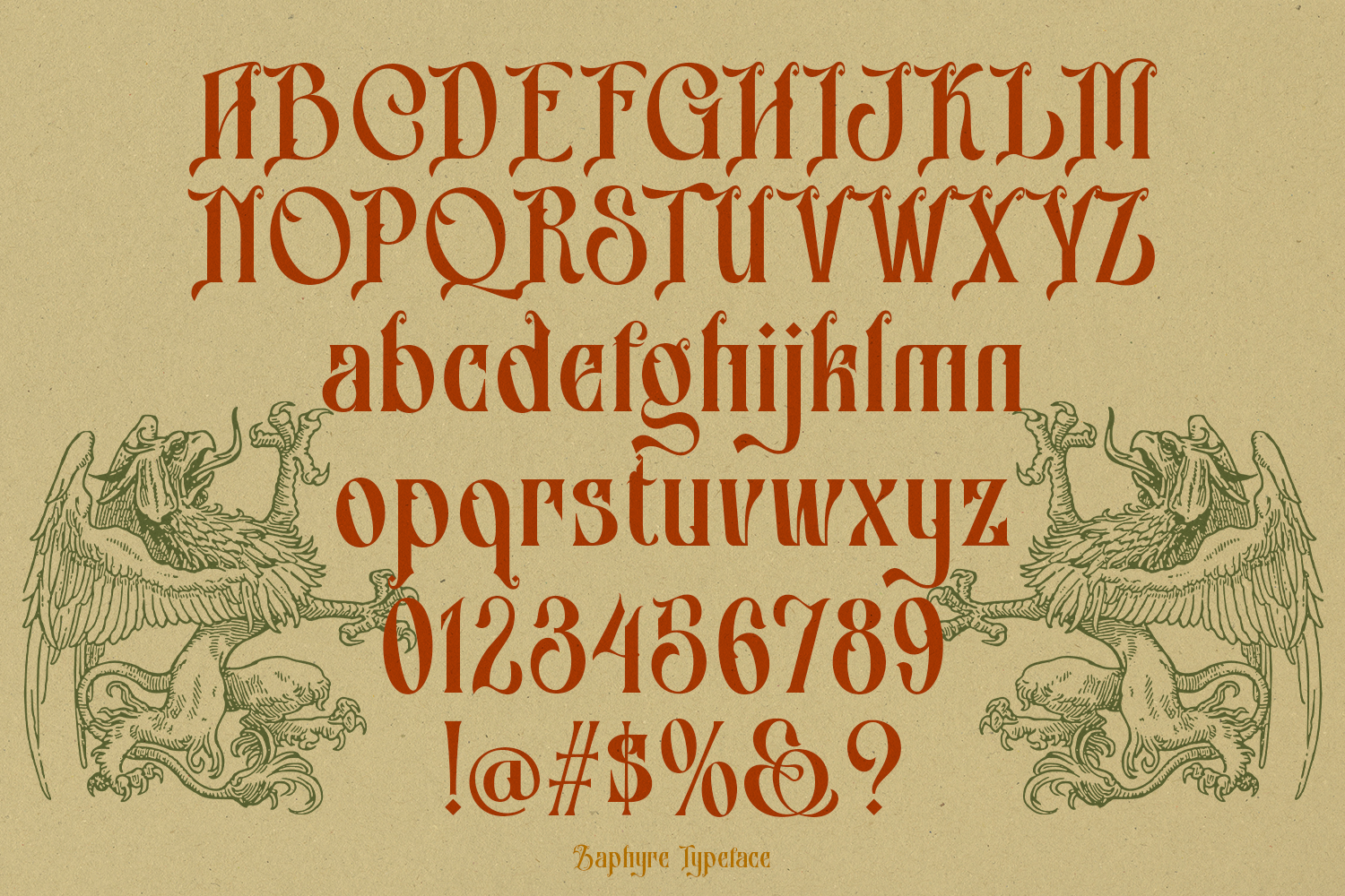 Introducing Zaphyre, a font that showcases an antique typeface style enriched with numerous ligatures, swashes, and swirling ornaments available in both regular and rough versions. This font exudes elegance, artistry, and character, with each letter flowing intricately to create a fantasy, magical, and mysterious ambiance. Its design evokes the typography found in medieval or mythical tales, making it ideal for branding, packaging, and creative projects that seek to capture a sense of wonder and nostalgia.